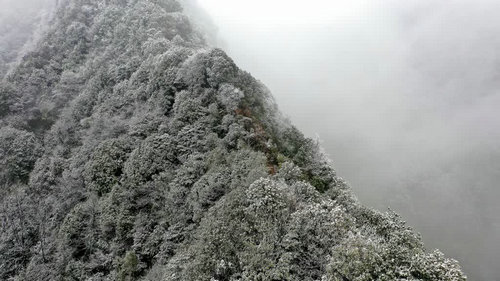 虎头山海拔高达1843米,处于亚热带常绿阔叶林区,独特的立体气候使其在冬季别有一番韵味。当气温跌至0℃以下,整个虎头山薄雾缭绕,山峰恰似披上了一层洁白无瑕的霜花羽衣,如钻石般晶莹剔透,闪烁着清冷的光泽。