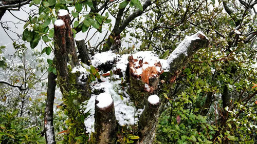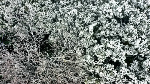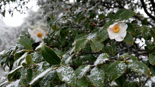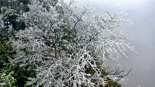 踏入山中,仿佛步入静谧的冰雪世界。雾凇轻盈地依附在树木枝干与枝叶间,连娇艳的毛蕊山茶花也被雾凇温柔环抱,别添雅致。雪松挺拔而立,与雾凇相互映衬,共同勾勒出一幅绝美的冬日画卷。漫山遍野的冰凌为寂静的山林增添了无限生机,肆意释放着独属于冬日的浪漫。