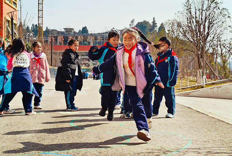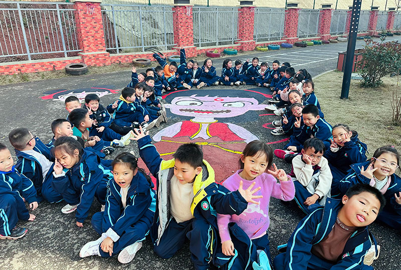 三五成群围成一团猜拳,双脚在格子间蹦蹦跳跳,亦步亦趋跟着带头小伙伴“蛇形”走位……孩子们快乐玩耍的身影和彩绘的地面交织相映,整个校园成为一片欢乐海洋。