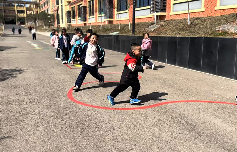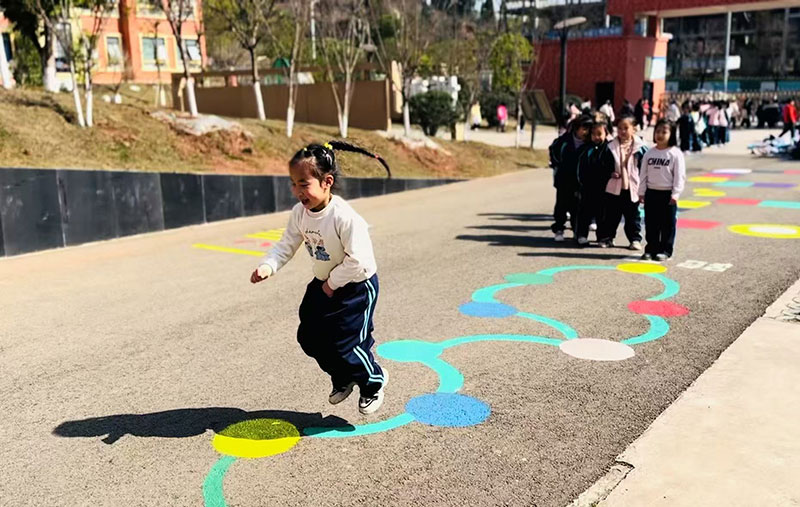 学校对教学楼走廊以及校园环形跑道等进行了改造,将包含健体、益智、趣味的传统地面游戏“画”进校园,给孩子们打造了一个五彩斑斓的“地面游乐场”。