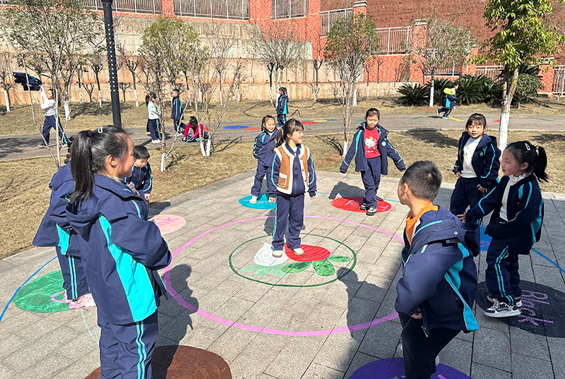 3月4日早上9点50分,课间铃一响,资阳市雁江区幸福博文学校的校园一下就沸腾了。学生们结伴前往教学楼的过道或者楼前空地,玩起各种由老师们精心设计的地面游戏。