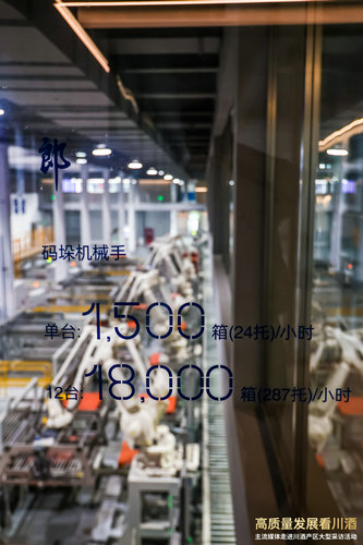 同时,这座被誉为“西南第一、兼香唯一”的智能立体库,更是以年周转储存量超10万吨,能够满足38辆货车同时作业,吞吐量超2万箱/小时的傲人数据,充分保障了郎酒的稳定供应,将郎酒的醇香四海传递。