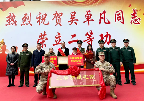 荣誉献功臣,军功耀门楣。3月6日上午,为深入开展“退役军人最期盼的10件事”活动暨拥军优属活动,营造崇尚典型、学习典型、争当典型的浓厚氛围。自流井区委、区政府、区人武部与四川武警总队、武警宜宾支队组成联合“报喜团”,为荣立二等功的吴卓凡及家属送上喜报和慰问金,并致以诚挚的祝贺。