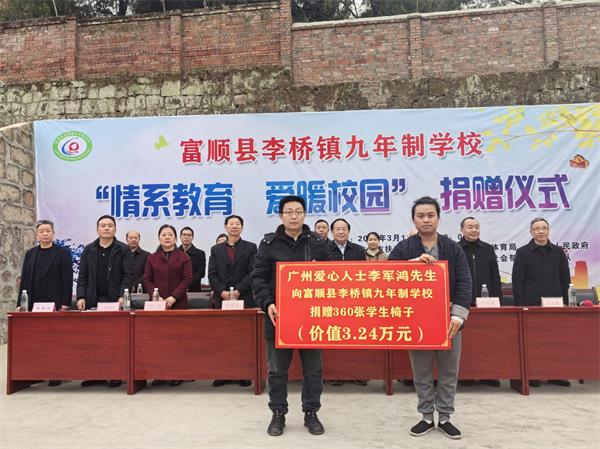 在市扶贫两会的牵线搭桥下,李桥籍爱心人士熊高润先生代表广州爱心人士李军鸿先生为学校慷慨捐赠了360张崭新的椅子,同时设立专项助学金,帮助8名家庭经济困难的学生减轻学习和生活压力,据悉,这份爱心资助自2024年9月起,将持续至学生们高中毕业。在捐赠仪式上,钟长安会长、李九校党支部书记、校长甘达权向李军鸿先生赠送锦旗并颁发捐赠证书,现场掌声雷动。熊高润先生代表李军鸿先生表达了对乡村教育的深切关注,他希望这份捐赠能在孩子们心中种下感恩的种子,激励他们志存高远,勤奋学习,将来以实际行动回馈社会。随后,镇党委书记高启强致辞,对李桥镇社会事业工作进行了汇报,高度肯定此次活动对社会事业发展的积极作用。